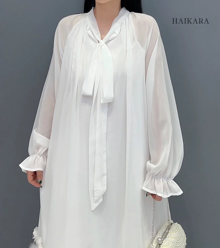 首元のボウタイリボンとふんわりとしたボリューム袖が、華やかなディテールの中にクラシカルで上品な印象を添え、パーティーやイベントの主役になれる一着です。 】