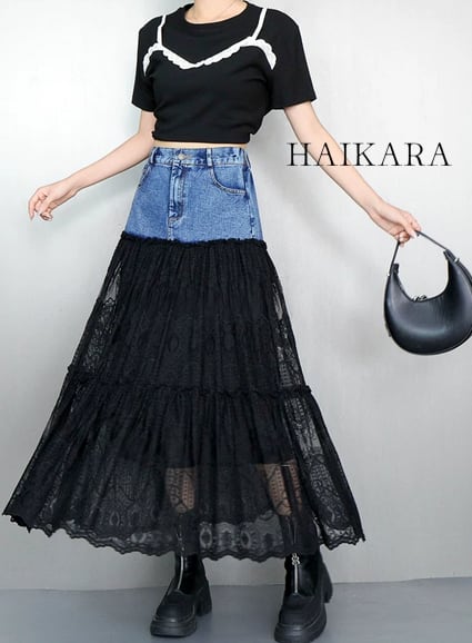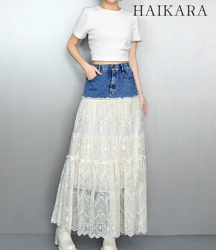 腰回りはタイトなデニム素材でスッキリと見せつつ、切り替えから下は贅沢なレースのティアードデザインにすることで、甘辛ミックスな絶妙なバランスを実現。