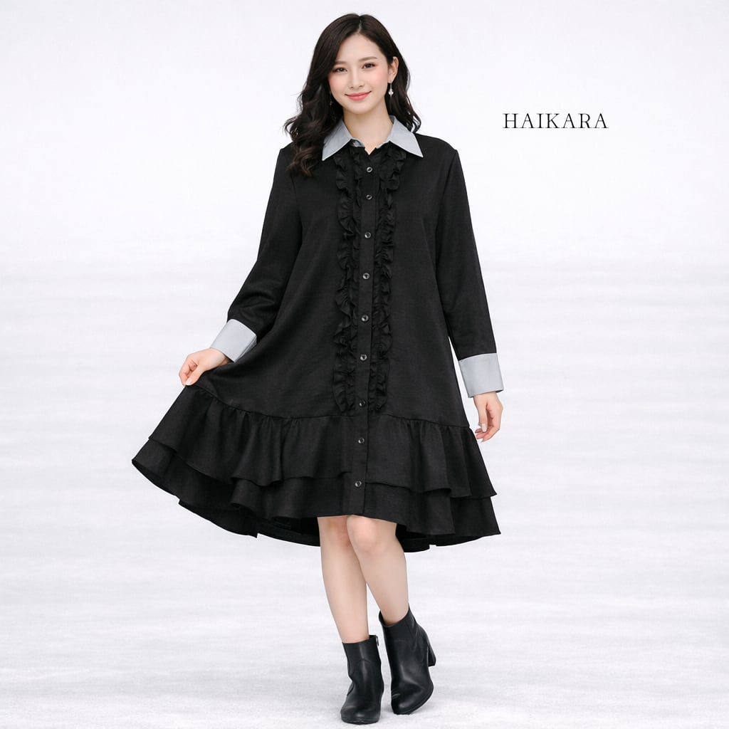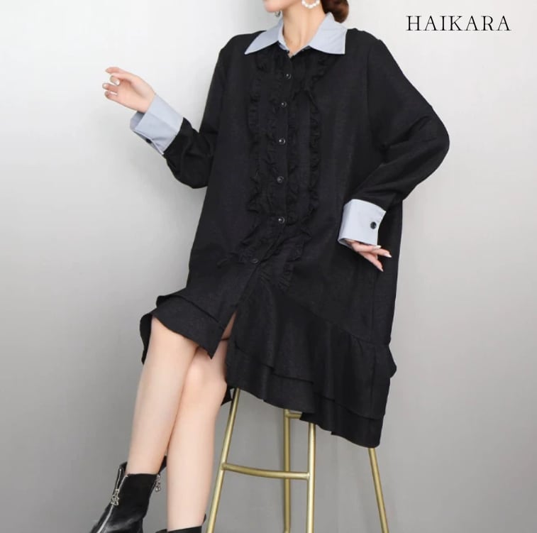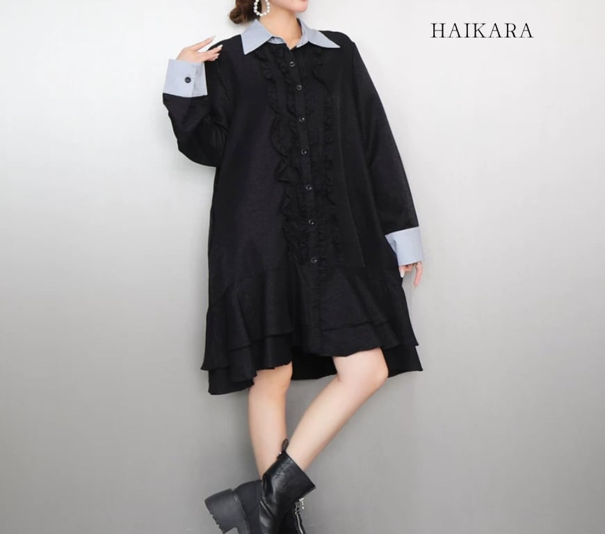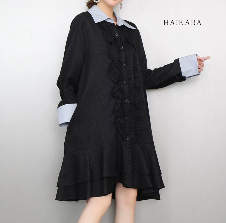 クレリックカラー フロントフリル ティアードシャツワンピース