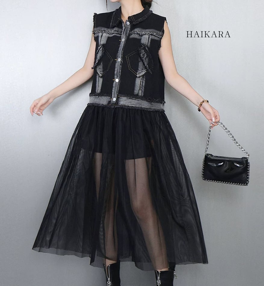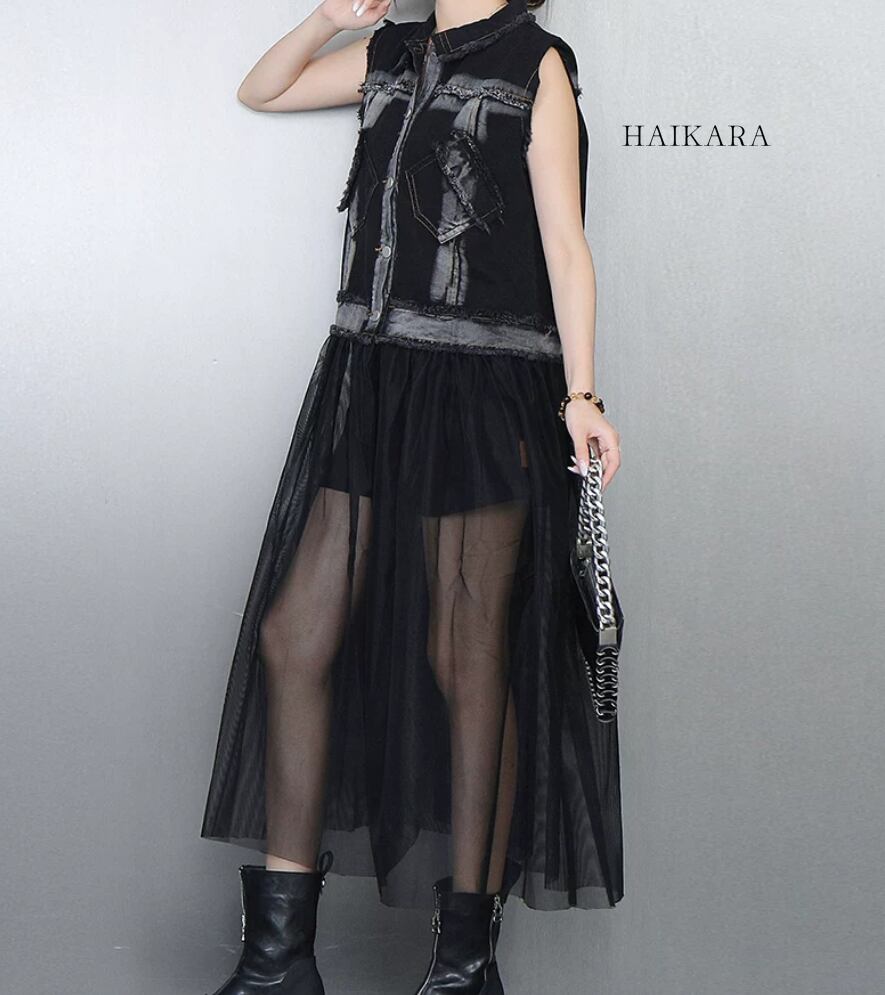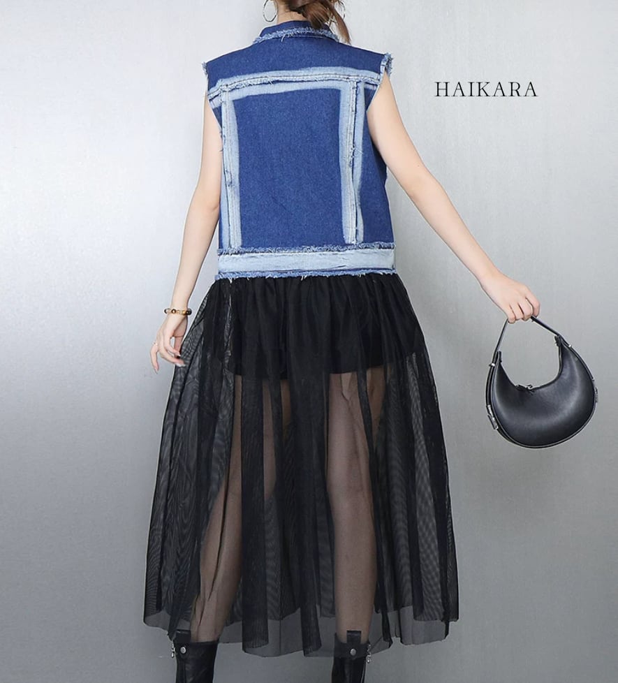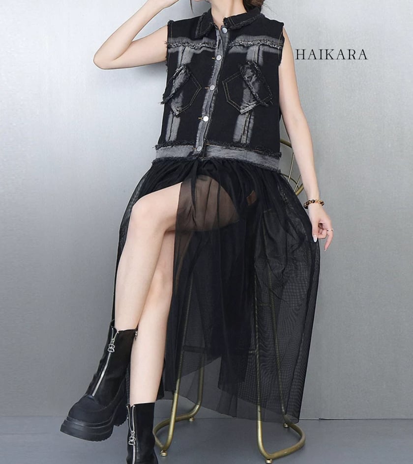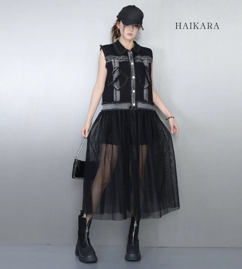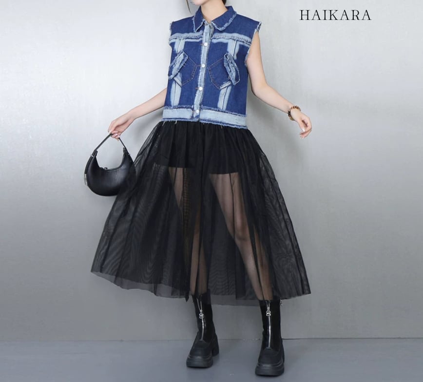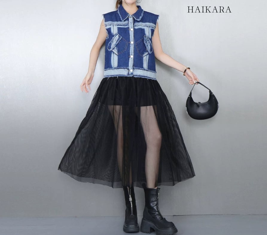 ★【 カットオフされたワイルドなデニムベストに、繊細なチュールをドッキングした、リメイク風の独創的なトップスです。