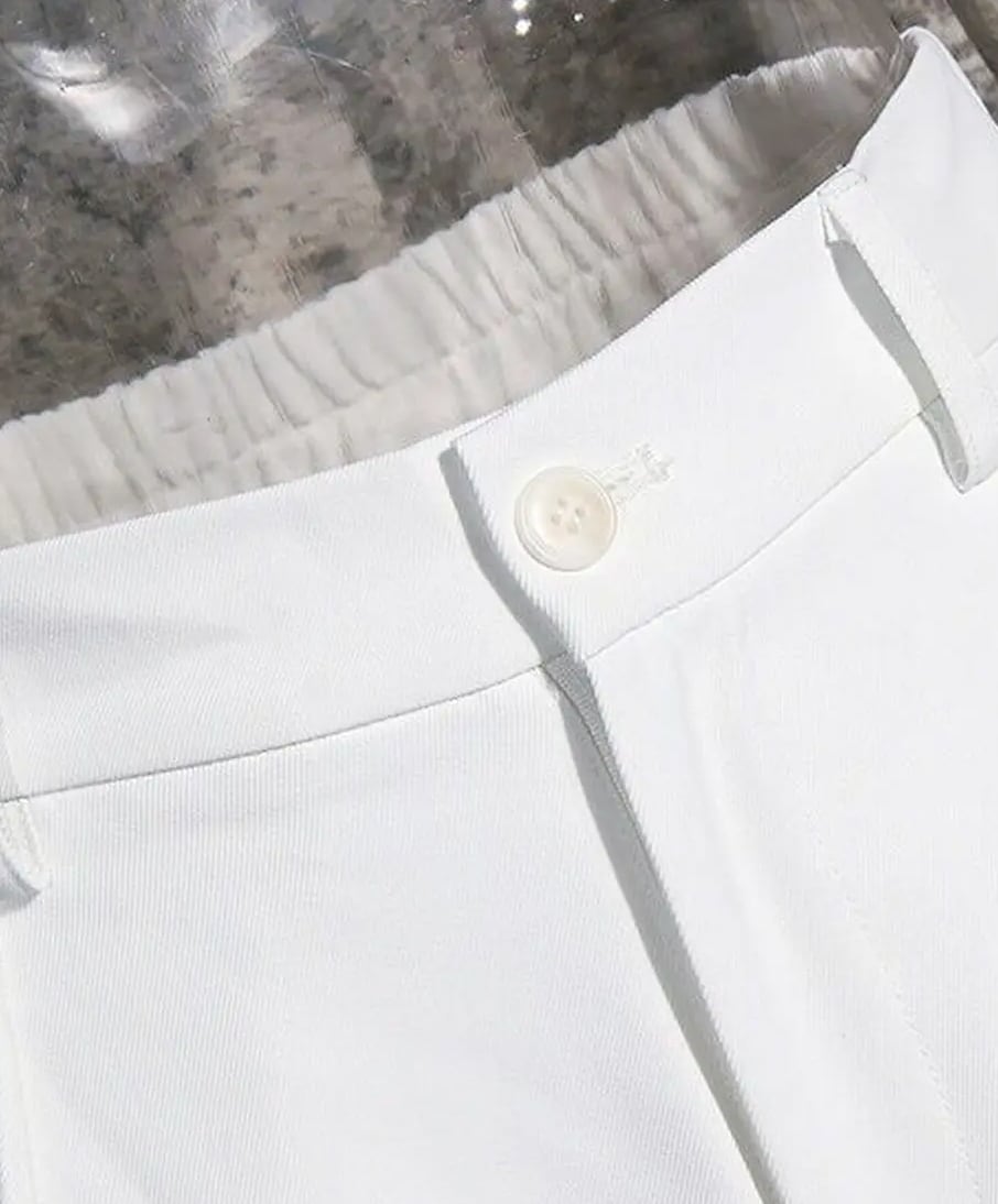 This set-up has a neat and clean look, but the sleeves of the jacket and the hem of the pants have been tightened to give it an air of casual elegance.