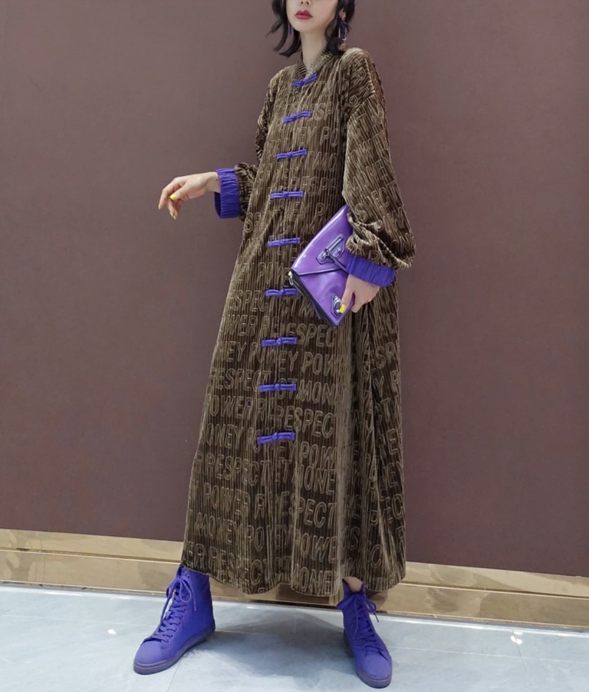 ★【 ベースの茶色と黒に紫のポイントが目を惹く高見えワンピース 】