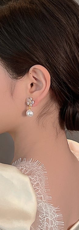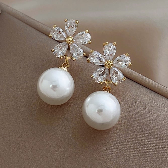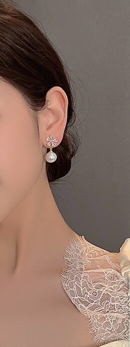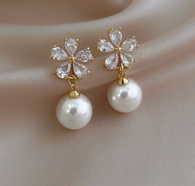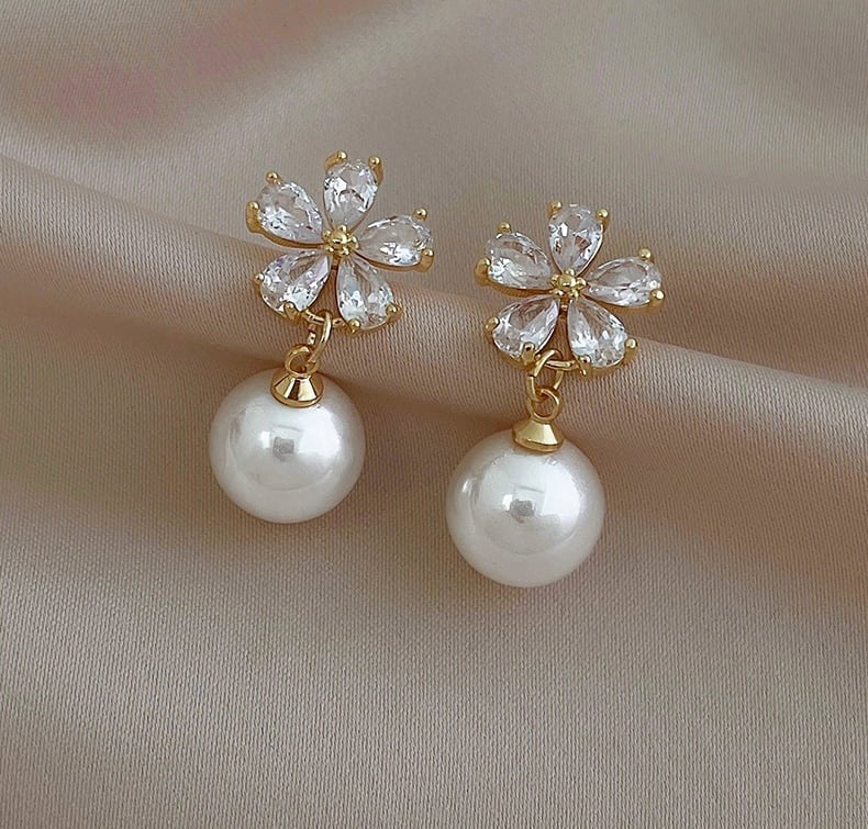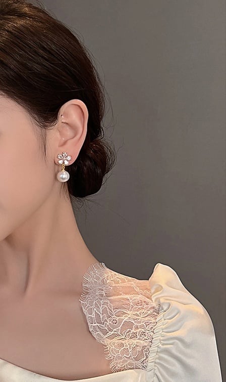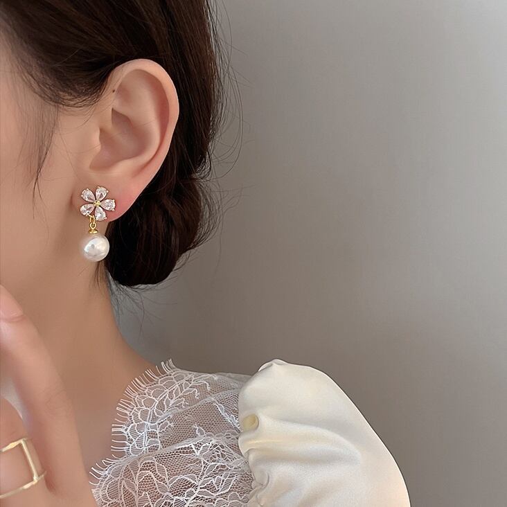 ★【 ジルコンをはめたお花デザインとゆれるパールが耳元を美しく飾ってくれる、華やかなデザインが魅力的なピアス 】