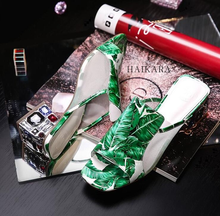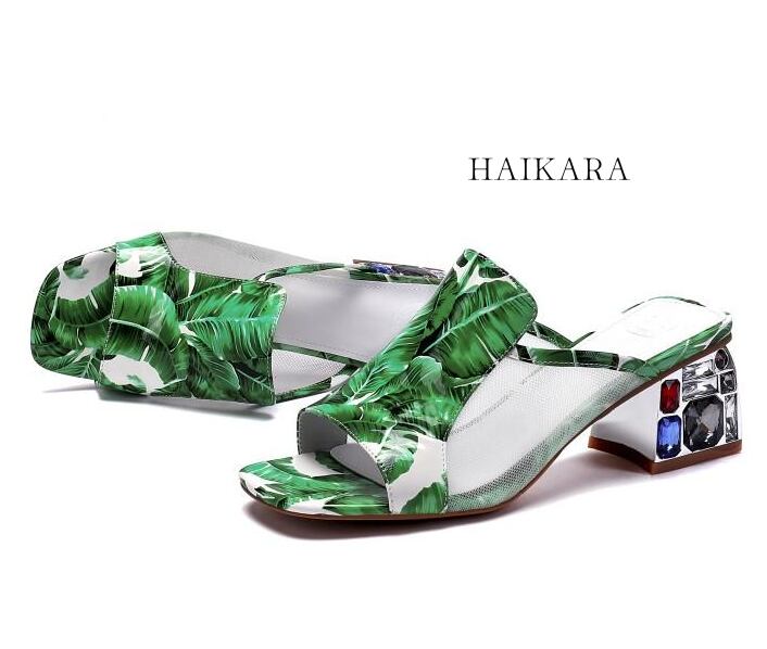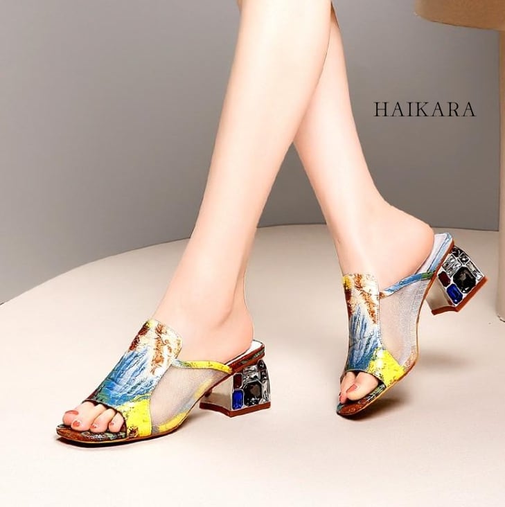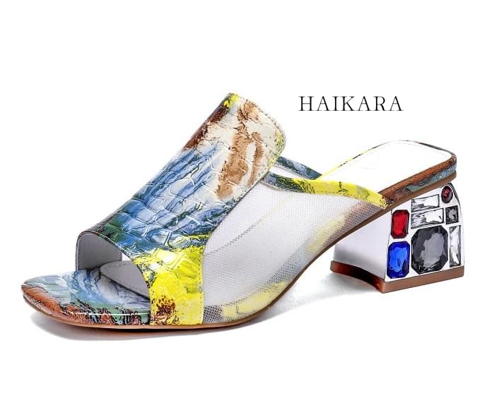 These sandals have an eye-catching design with a colorful pattern and an embellished heel.