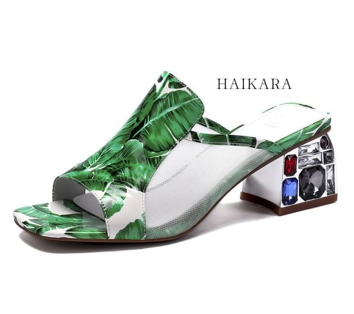 ★【 カラフルな柄が目を引くデザインが魅力的、ヒールにも飾りが付けられたサンダル 】