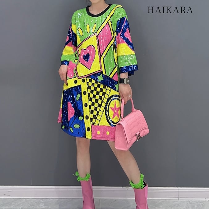 The bright colors of the heart and other patterns in this pop design and the sparkle of the sequins bring out the cuteness of this one-piece dress.