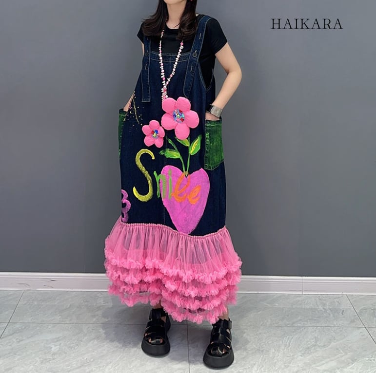 ★【 ブラックの生地とピンクの柄やフリルが合ったメリハリ感のあるデザイン、カジュアルなデニム地のサスペンダー式ワンピース 】