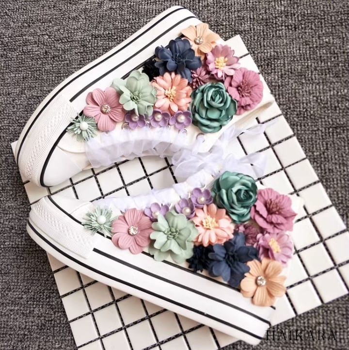 Sneakers with a colorful appearance and bouquet-like design with three-dimensional flowers throughout the entire body.