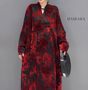 ★【 中華風スタイルの飾りボタンを使用したおしゃれなデザイン、マーブル柄の生地を使用したワンピース 】