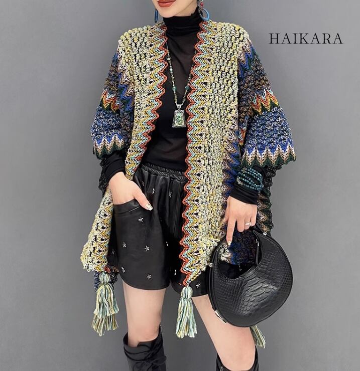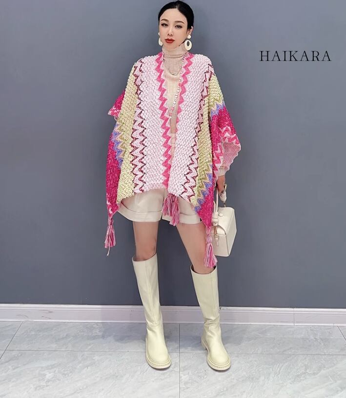 ★【 カラフルな色合いの柄を配したカジュアルデザイン、セーターのような風合いの暖かなケープ 】