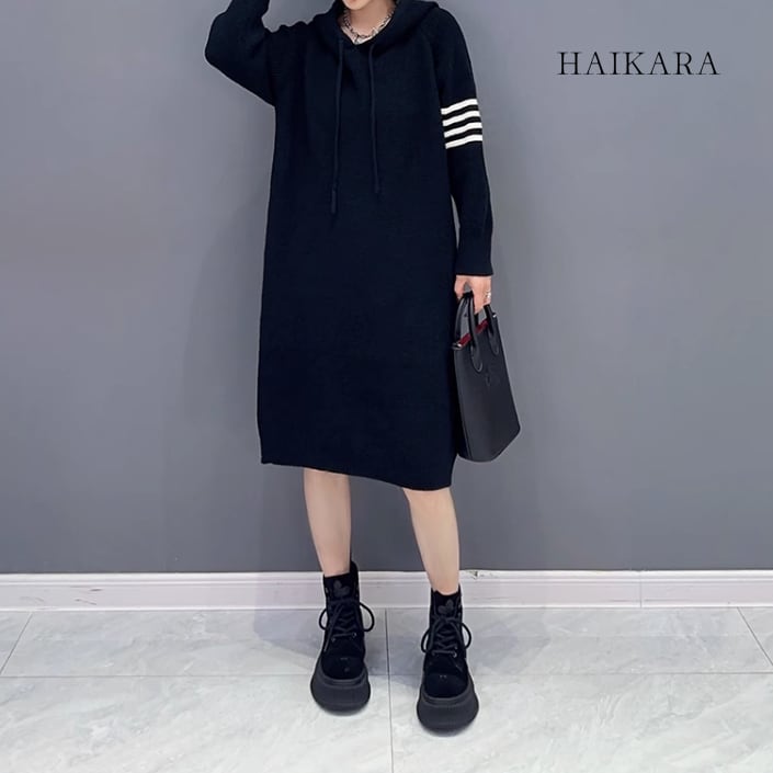 ★【 ニット生地を使用したゆったりとしたデザイン、カジュアルスタイルのフード付きワンピース 】