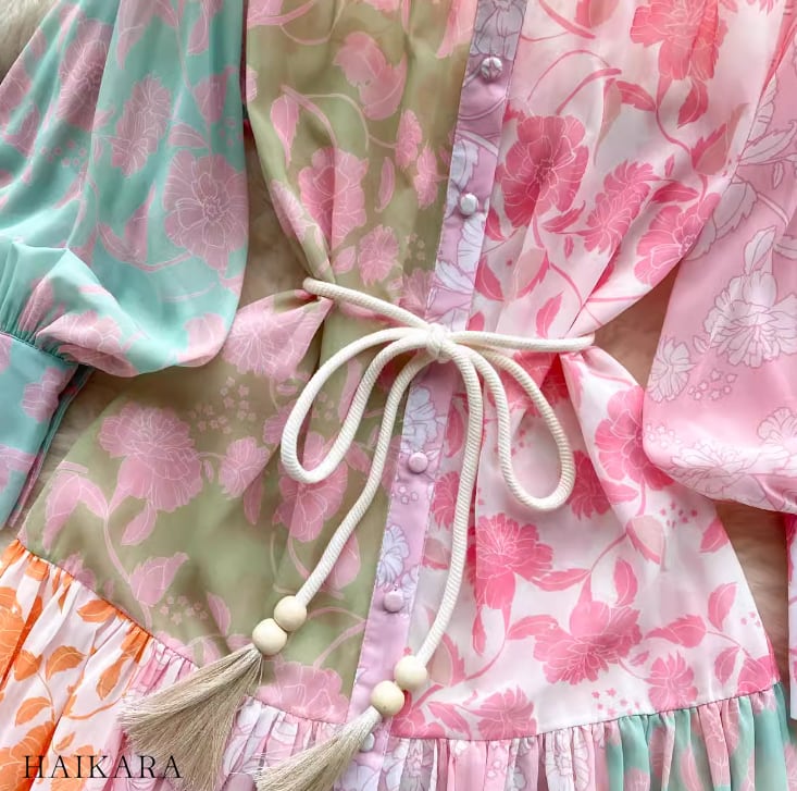 ★【 パステルカラー調の花柄生地を合わせた柔らかな切り替えデザイン、ウエストの紐がアクセントになったふわりとしたワンピース 】