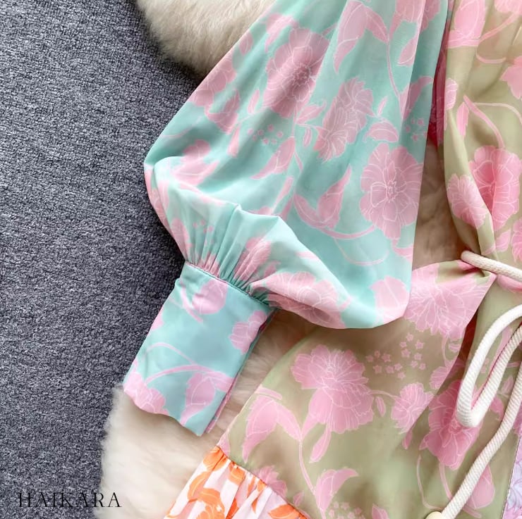 Pastel color floral pattern switching puff sleeve dress