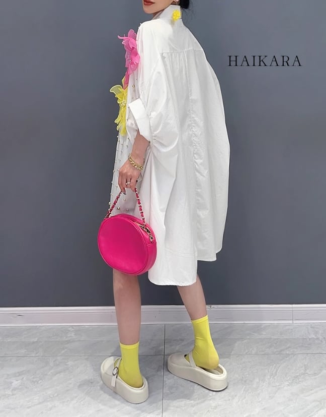 ★【 花のコサージュと全体にビーズを散りばめた明るいでザイン、華やかな装いを楽しめるシャツワンピース 】