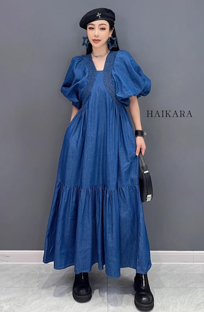 This casual, puff-sleeved dress is made of lightweight denim fabric and has a natural feel.