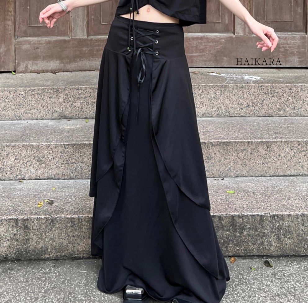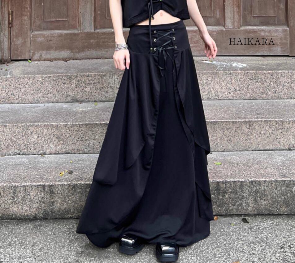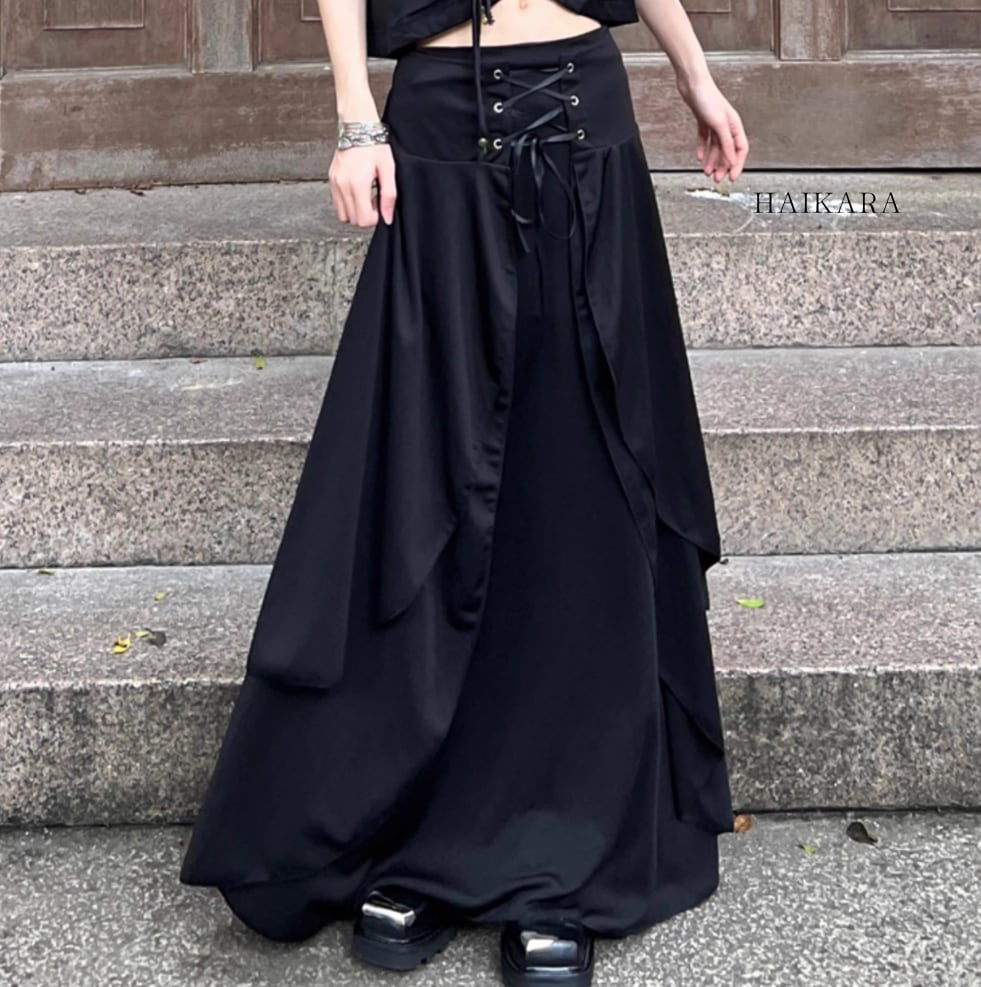 ★【 ウエストにレースアップデザインを使用したシックな見た目、ロング丈のスタイリッシュなキュロット 】