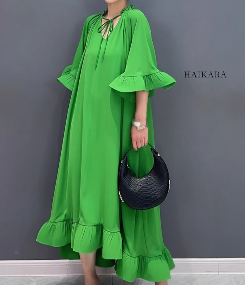 ★【 大きなフリルを使用したカラフルデザイン、エレガントな装いのロング丈ワンピース 】