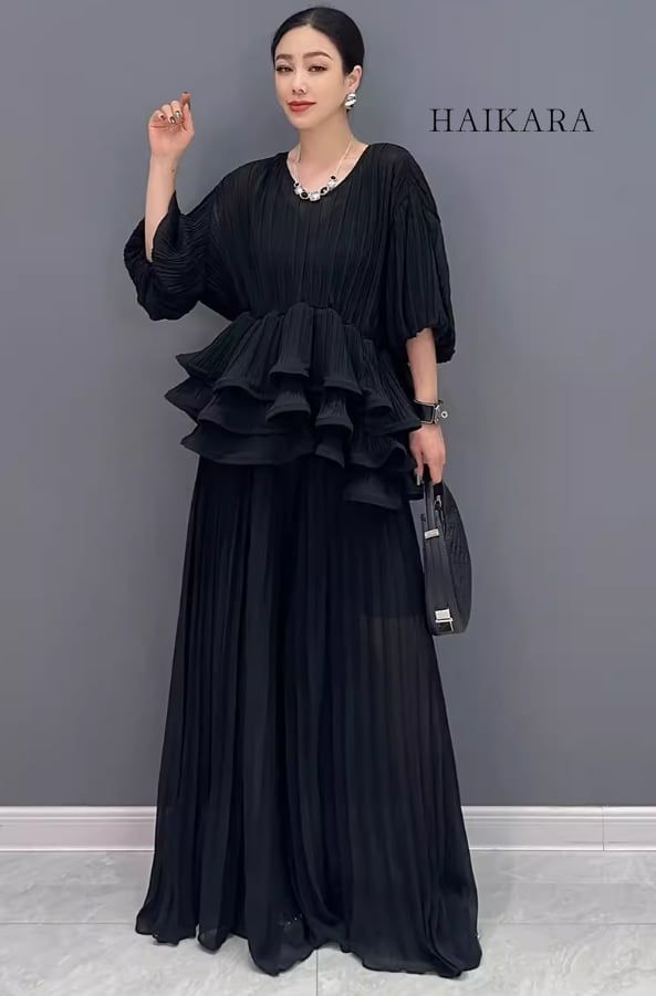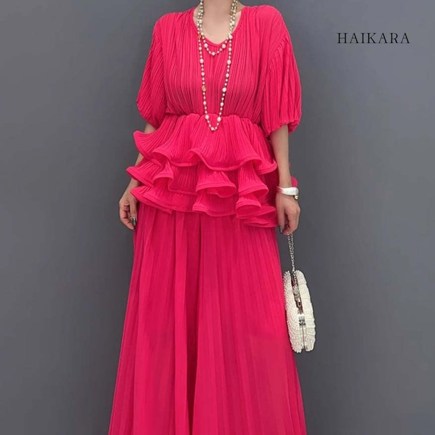★【 ウエストのフリルと全体のプリーツがポイントの華やかな見た目、エレガとな雰囲気のセットアップ 】