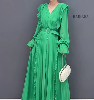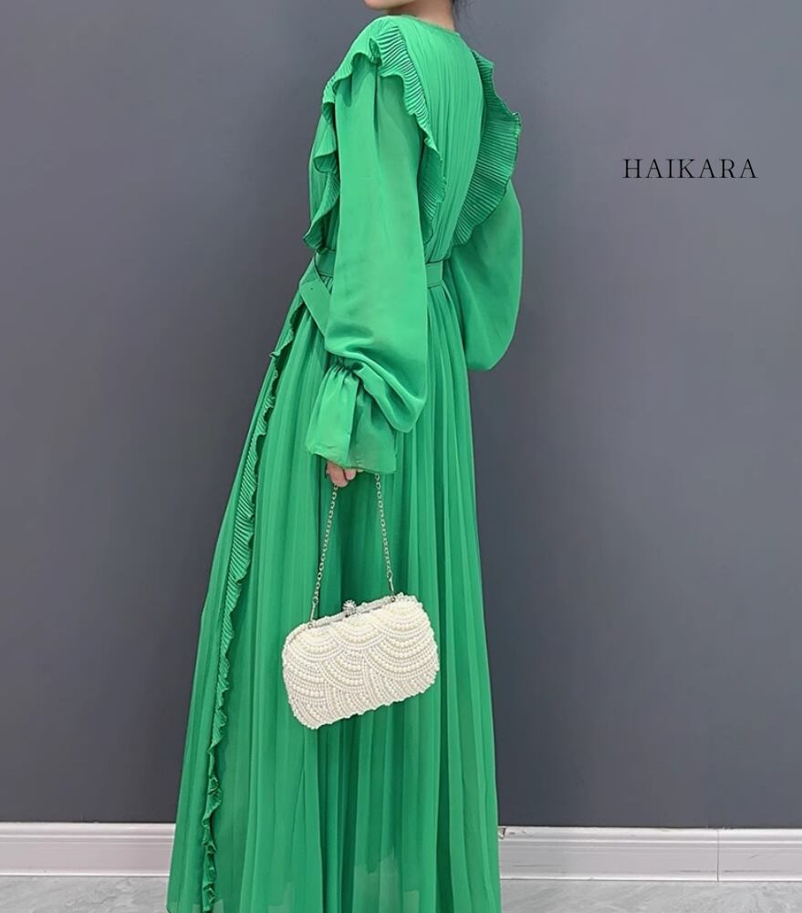 ★【 フリルとプリーツ加工を施した華やかなデザイン、レトロな雰囲気を感じさせるロング丈ワンピース 】