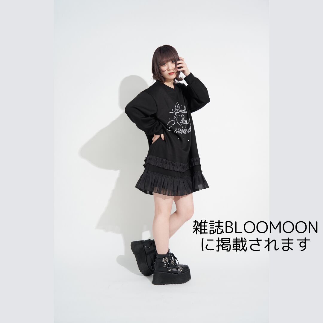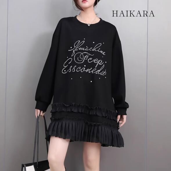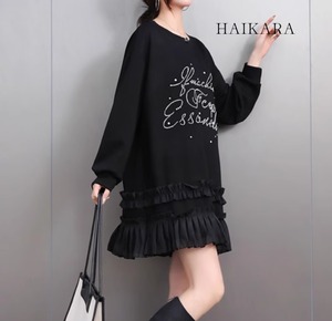 ★【 中央に文字グラフィックを入れたカジュアルデザイン、裾のフリルがアクセントになったシャツ風ワンピース 】