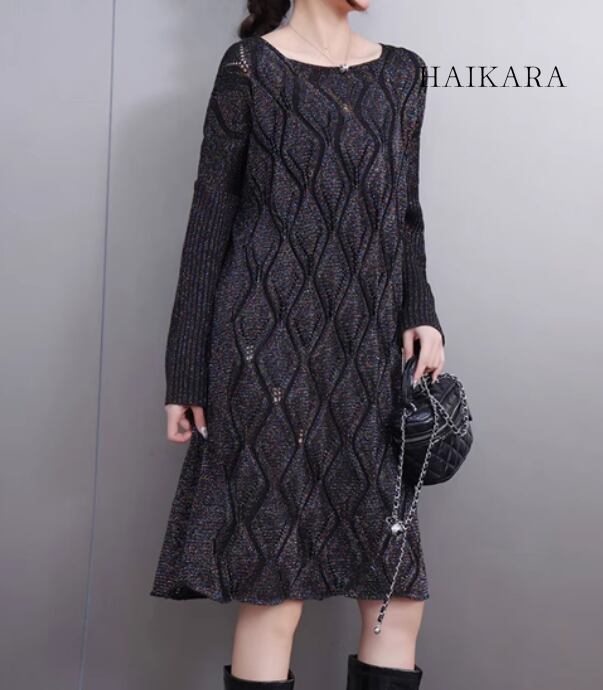 ★【 網目模様を取り入れたニット製生地を使用したデザイン、暖かな肌触りのワンピース 】