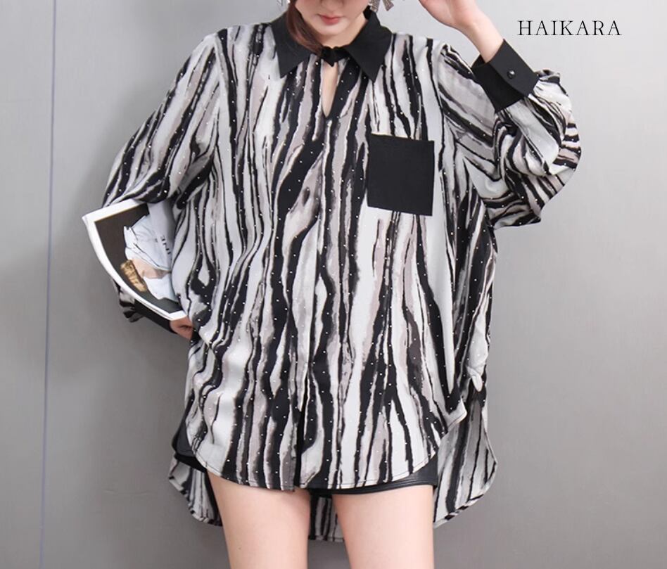 ★【 モノトーンカラーのボーダー柄デザインがポイント、シックな風合いのトップス 】