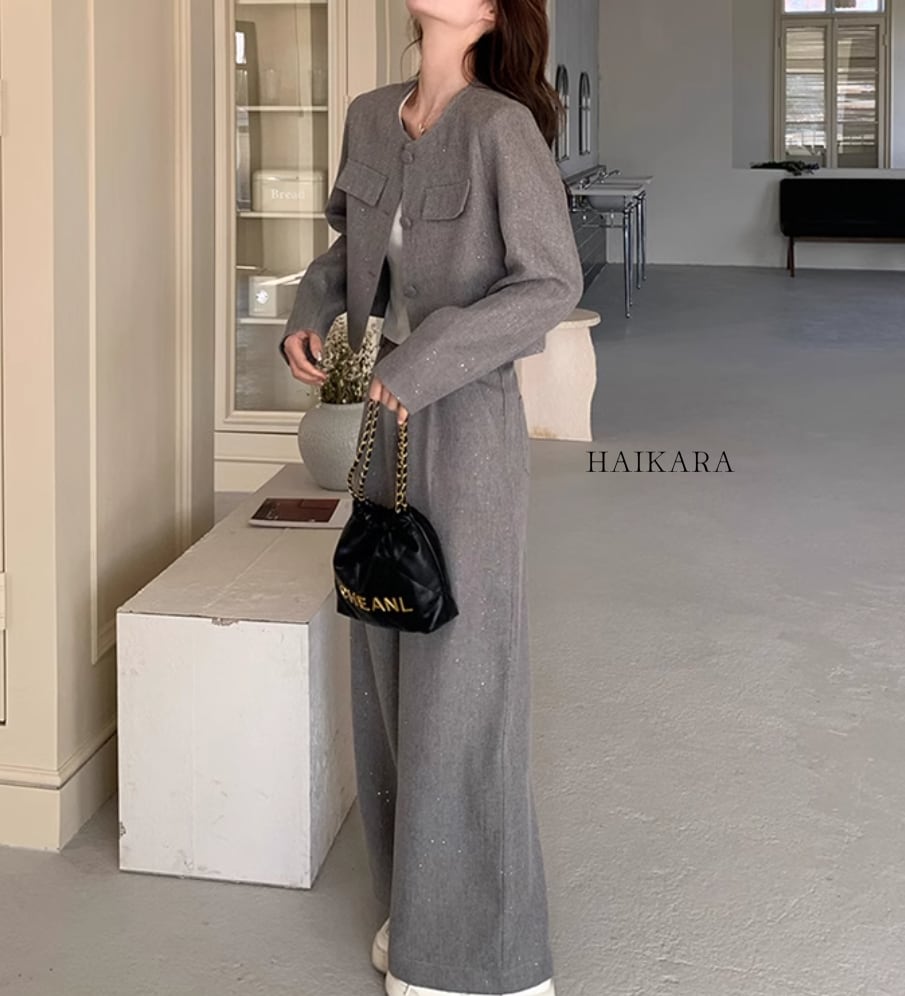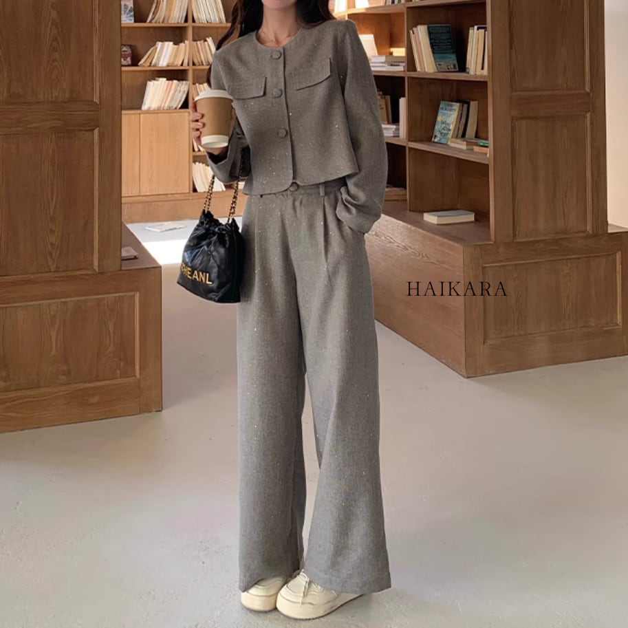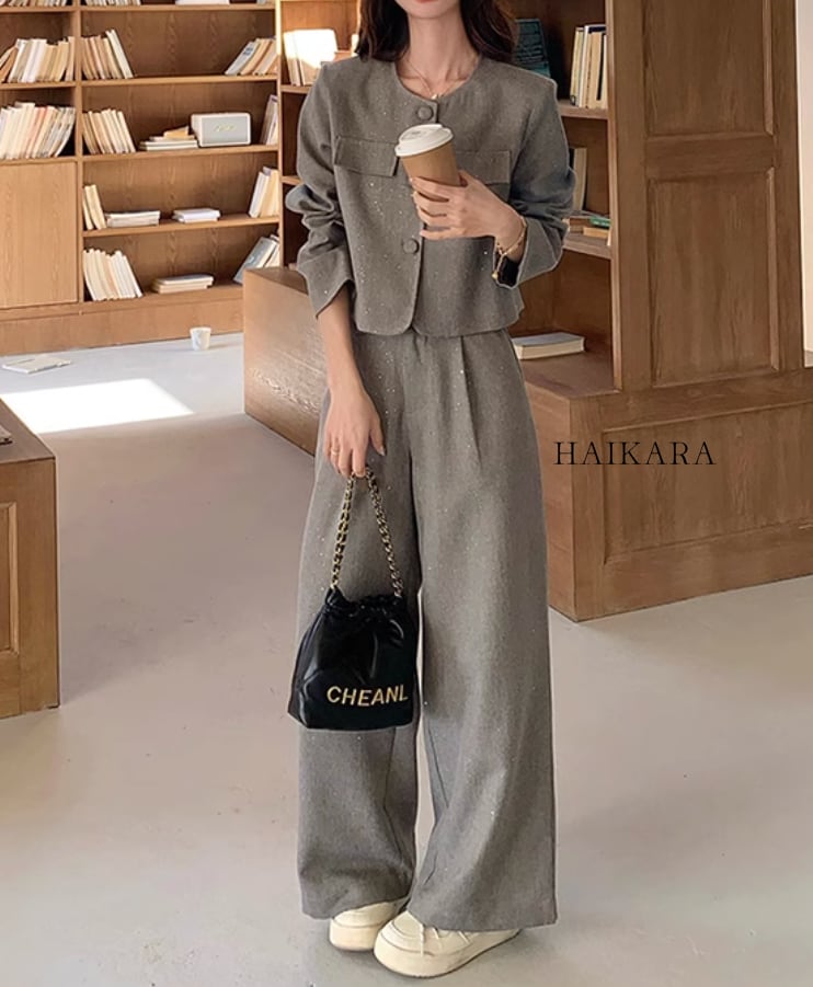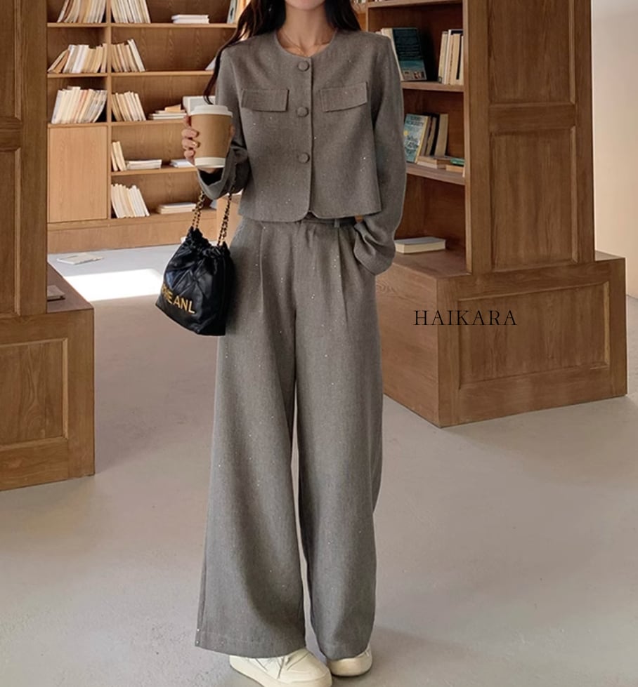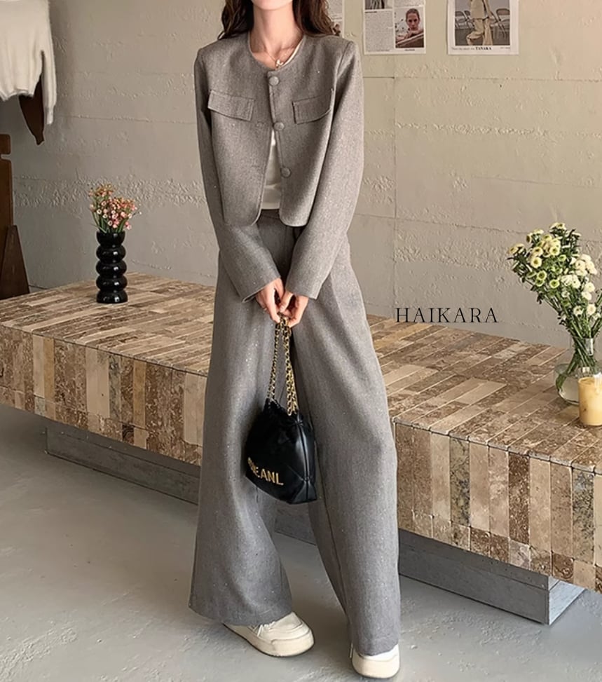 The set-up is a chic design with a relaxed silhouette and calm colors, easy to wear for various occasions.